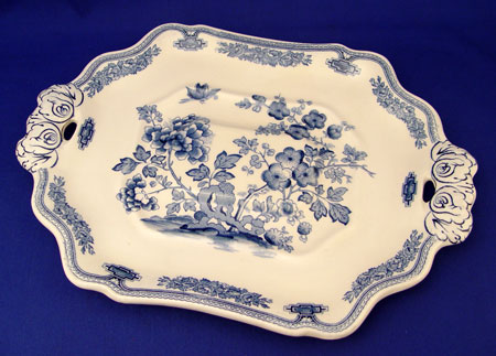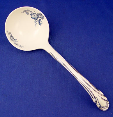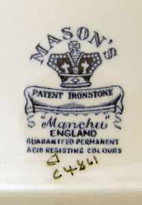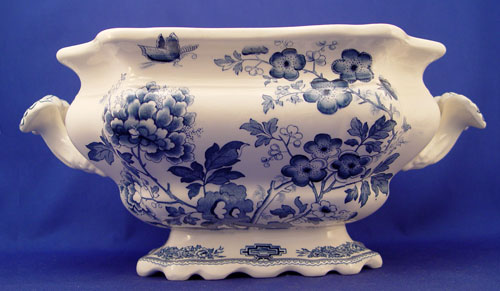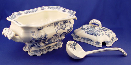 MASON'S ''MANCHU'' BLUE & WHITE SOUP TUREEN: Includes the underplate, ladle, and cover. Underplate is 14 3/4'' long, the tureen with cover is 10''h.