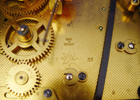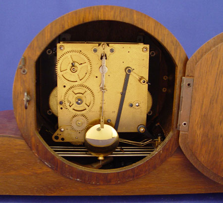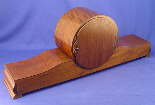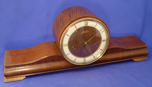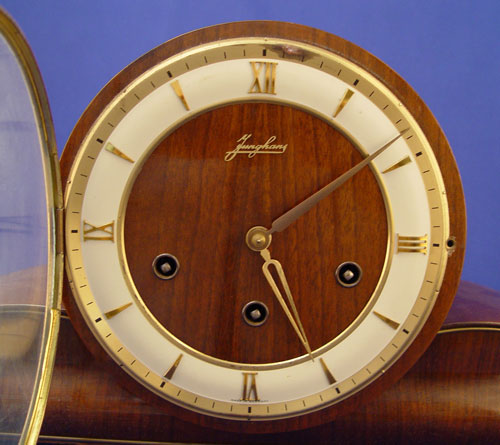 JUNGHANS GERMANY MANTLE CLOCK: 8 3/4'' high x 22 1/2'' wide x 6'' deep. Face 6 3/4'' diameter. Richly grained veneer finish. Marked Junghans Made in Germany on face. Note minor scratches to front veneer.
