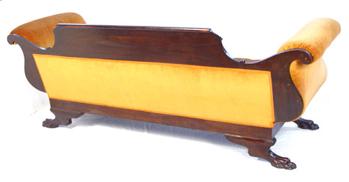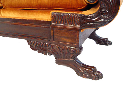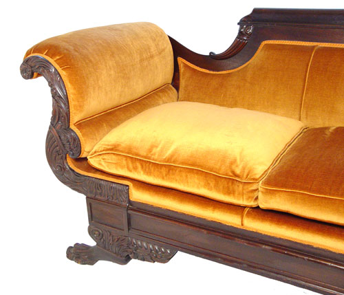FEDERAL - EMPIRE PERIOD CARVED MAHOGANY SOFA: Straight back, rolled arms, carved skirt and front of the arms. 3 cushion seat. Excellent restored condition. 34 1/2'' high x 91'' wide x 30'' deep.