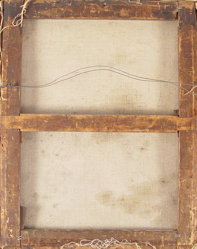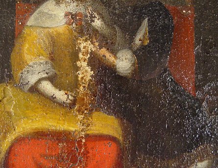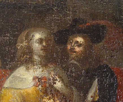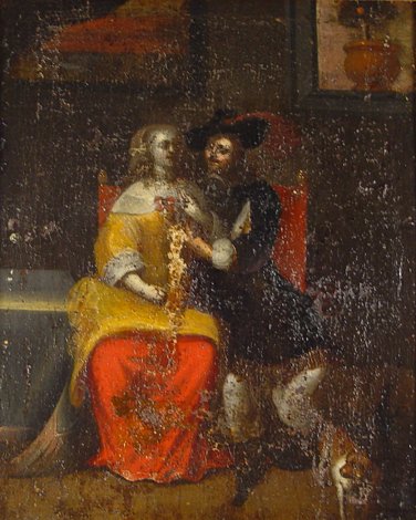 VERY EARLY OIL ON CANVAS PAINTING OF A COURTING COUPLE: 22 3/4'' x 17 1/2'', encased in a gold gilt frame, 27 1/2'' x 23 1/2''. Extensive restoration and damage, needs work.