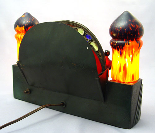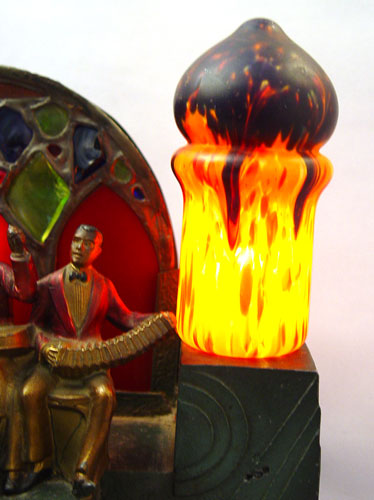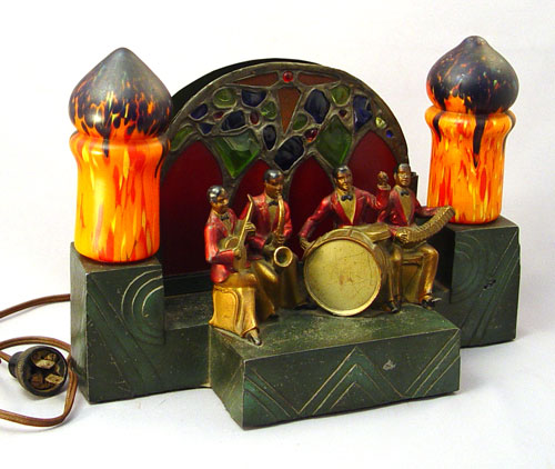 ART DECO JAZZ BAND LAMP: Circa 1930's bronzed figural quartet flanked by Czech glass shades. The band is on a stage, the stage backdrop is made of leaded glass and bakelite / catalin panels. 9''h. x 13'' wide x 5 1/2'' deep.