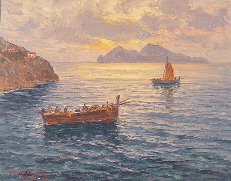 ODIERNA, A., (Italian, 20th C): Capri Coastal Scene, Oil/Canvas Board, 16'' x 20'', signed, encased in carved frame, 24'' x 28''. Several minor abrasions with paint flecks.
