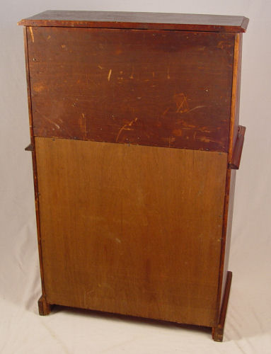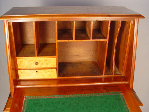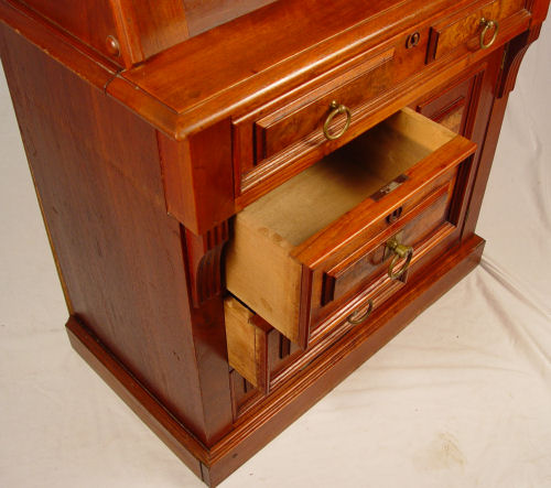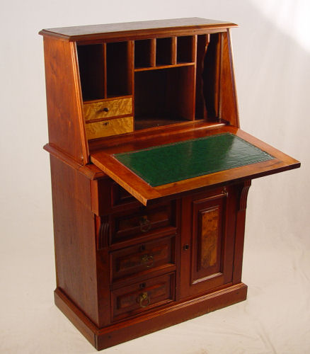 DIMINUTIVE VICTORIAN WALNUT FALL FRONT DESK: Interior of desk with pigeon holes. Paneled front and drawers, cabinet door and drawers under fall front desk. 47''h. x 30'' x 17''.