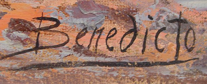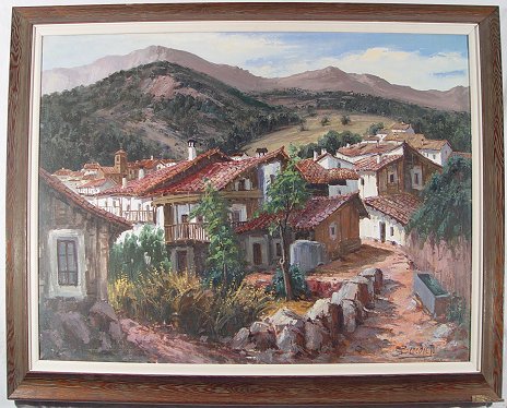 SPANISH VILLAGE LANDSCAPE PAINTING SIGNED BENEDICTO: Oil/C, 29'' x 39 1/2'', framed, 35'' x 45''.