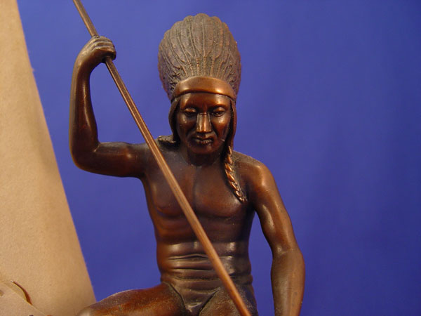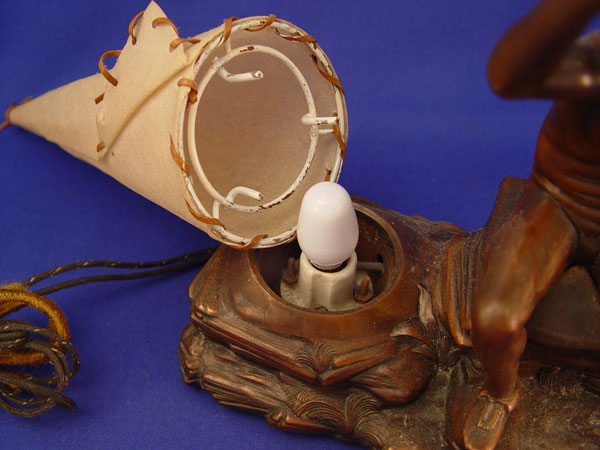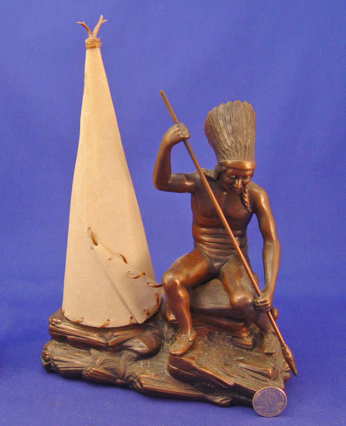 JENNING BROTHERS INDIAN AND TEEPEE FIGURAL LAMP: Bronzed figure, parchment teepee shade. 10''h, 7 1/2'' dia. Single bulb. Signed JB 2227. Original cord should be replaced for safety.