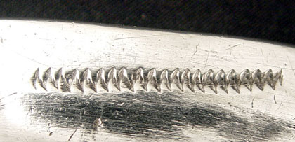 EARLY 19TH CENTURY GERMAN SILVER BOWL: Marked with pre 1820 German assayers Tremolierstrich (zig zag mark). Several other unknown maker and town marks. Please note condition. Unsure of metal content. 11 1/2'' dia. Approx 24.8 troy oz.