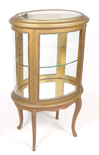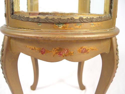 FRENCH VITRINE CURIO DISPLAY CABINET: Oval in shape with beveled glass top. Glass shelf interior, mirror bottom. Painted decoration, ormolu mounts, cabriole legs. 42'' high x 24'' wide x 18'' deep