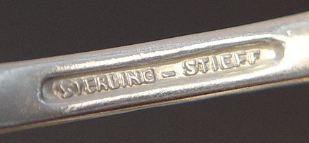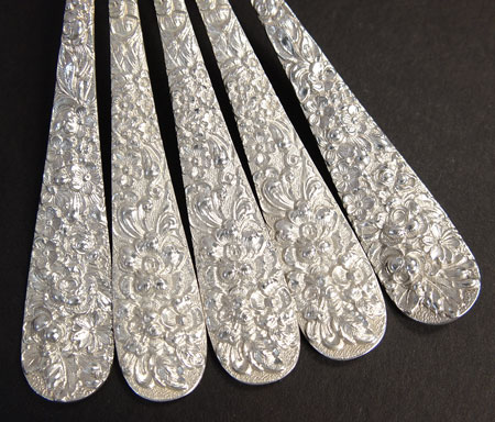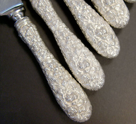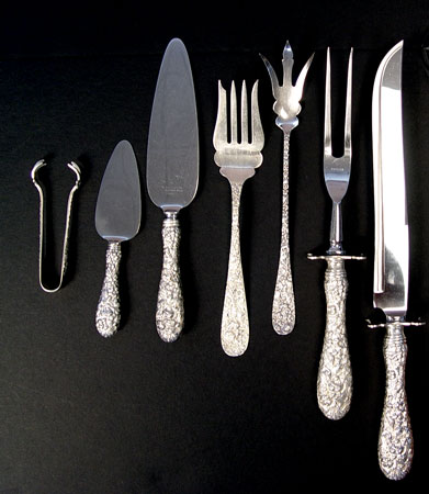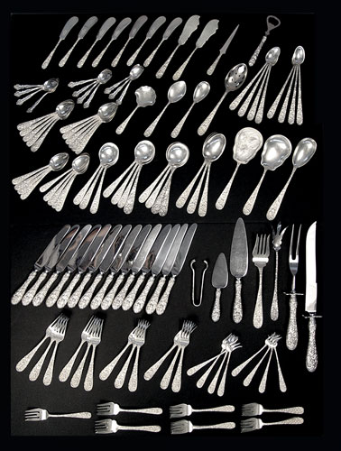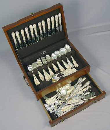 STIEFF STERLING FLATWARE IN THE ''ROSE'' PATTERN: 127 pieces to include 15 dinner knives with bolster handle (8 7/8''), 12 dinner forks (7''), 13 salad forks (6''), 6 cocktail forks (5 7/8''), 2 lemon forks (6''), 19 teaspoons (5 7/8''), 1 teaspoon (5 1/2''), 8 round soup spoons (6 1/2''), 3 round gumbo spoons (7''), 3 serving spoons (7 3/4''0, 8 ice tea spoons (7 1/2''0, 7 butter knives (6''), 2 master butter knifes (7 1/8''), chased berry spoon (8 1/8''), solid berry spoon (8''), serving spoon (8 1/2''), sherbert spoon (6''), jelly server (6 1/4''), pierced serving spoon (7 7/8''), small scalloped serving spoon (5 1/4''), large fish serving fork (8 5/8''), large lettuce fork (9 1/8''), carving set large meat fork 11 5/8'' and knife 13 3/4'', cheese server (6 1/4''), cake server (9 1/2''), salt spoon 2 7/8'', sugar tongs 4 1/8'', bottle opener 5 3/4''. Also included is a Kirk & Son letter opener 6'' and 11 Rogers silverplate demitasse spoons. Approx. 138.2 troy oz.
