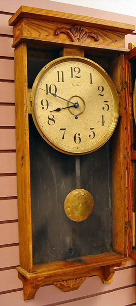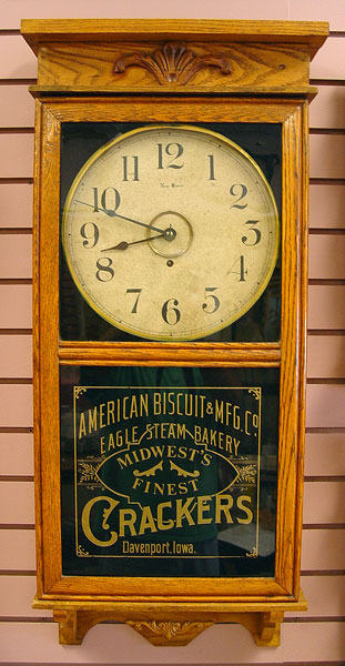 NEW HAVEN RAILROAD STATION ADVERTISEMENT REGULATOR CLOCK: Circa 1890's, from the Schenectady New York railroad station, advertising American Biscuit & Mfg. Co. Eagle Steam Bakery Midwest's Finest Crackers, Davenport Iowa. Oak case with original wavy reverse painted glass front top section. Marked New Haven on front of original 11 1/2'' dia. brass face with Arabic numerals. Key & pendulum movement Measures 36 1/4'' high x 16 1/4'' wide x 5 1/4'' deep. Please note wood shelf brackets on base appear to be replacement.