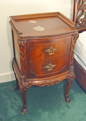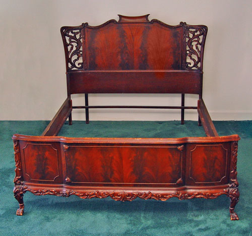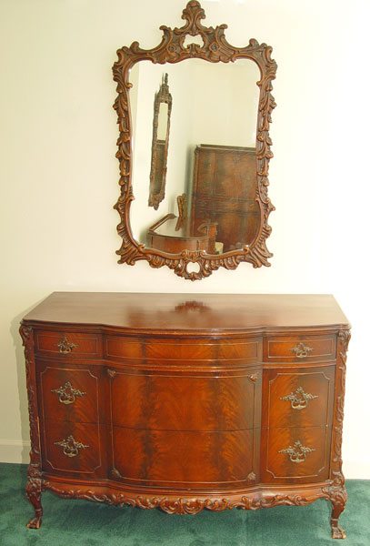 10 PIECE 1930'S FRENCH STYLE BEDROOM SUITE: To include 5 drawer TALL CHEST (53'' high x 37'' wide x 23'' deep), 3 drawer DRESSER (35 1/2'' high x 50'' wide x 24'' deep), VANITY (30'' high x 52'' wide x 20'' deep), CHAIR, 1 drawer NIGHT STAND, 2 drawer NIGHT STAND, 2 MIRRORS, and FULL SIZE BED.