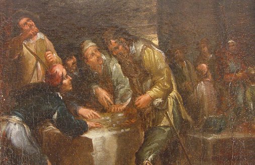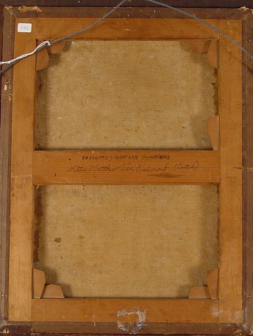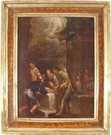 EARLY FLEMISH GENRE SCENE WITH FIGURES AFTER VAN HELMONT: 18'' x 14'', no visible signature, framed, 22'' x 18''. Relined, inpaint scattered, needs work, scattered missing paint.