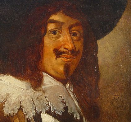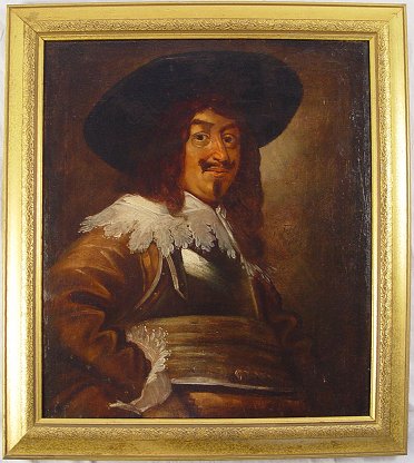 EARLY PORTRAIT PAINTING OF A CAVALIER: Oil/Canvas, 27'' x 23 1/2'', monogrammed F.H.?, dated 1645?, encased in later frame, 32'' x 29''. Has been re-lined, numerous repairs and in-paint throughout. Sold as is.