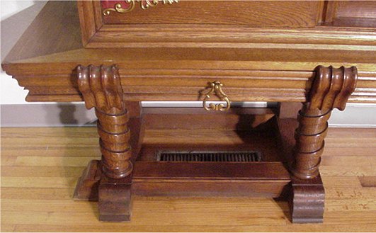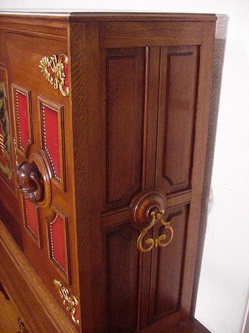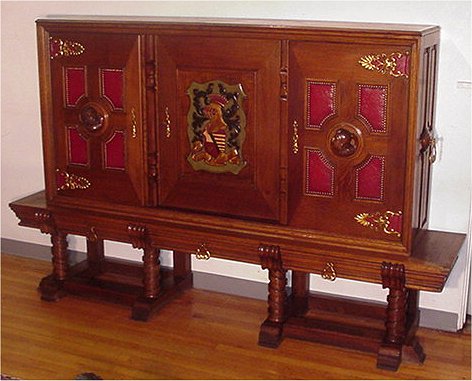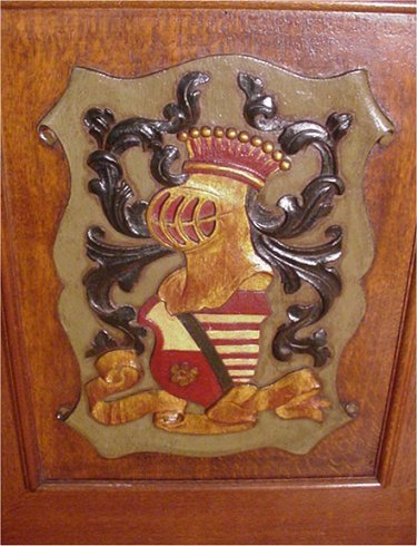 ARMORIAL BLIND BOOKCASE: Cabinet with three carved wood doors, knight head handles, three adjustable shelves to each section with the center set being shaped, on base with turned supports, 5'h. x 94''w. x 21''deep.