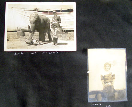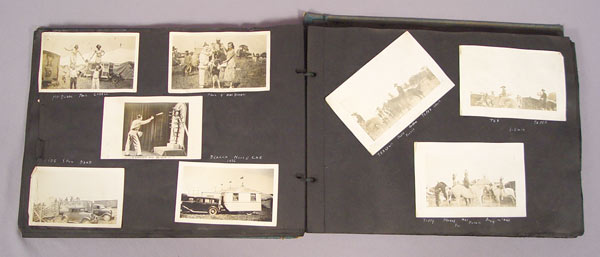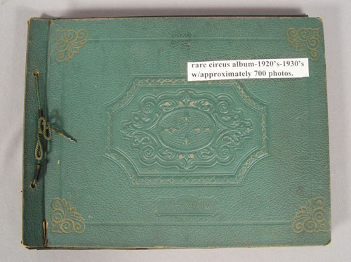 1930'S BARNETT BROTHERS CIRCUS PHOTO ALBUM: Approx. 700 vintage photo's of behind the scenes life of performers in the Barnett Brothers, Wallace Bro's, and Haag Circus's. Primarily Barnett Brothers. Pictures of nearly every performer with names underneath, animals, trailers and towns. Book measures 15 1/4'' x 11 1/4'' x 1 3/8''.