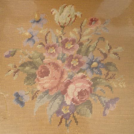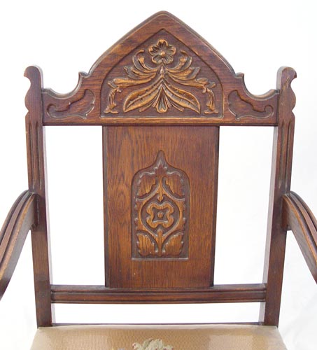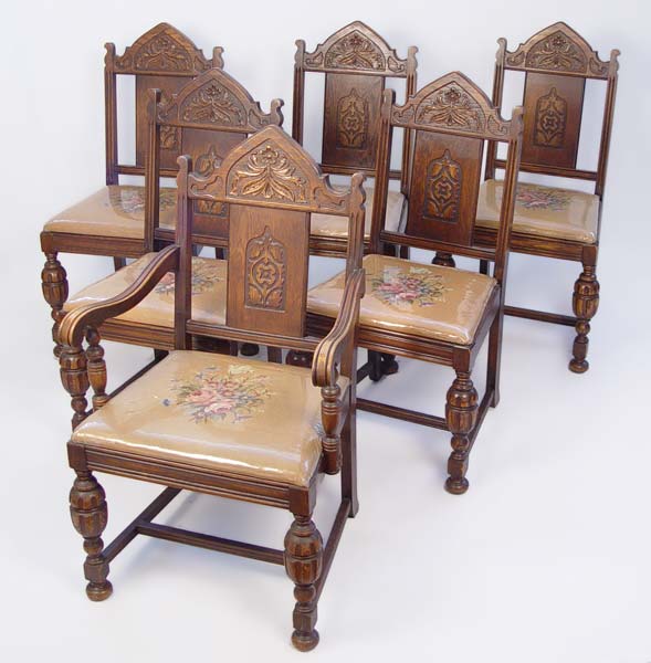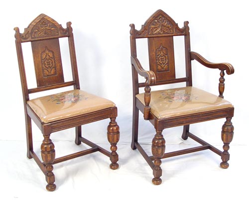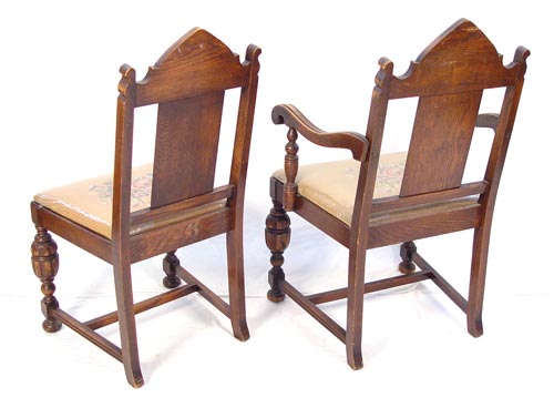 SET OF SIX JACOBEAN STYLE CHAIRS BY THOMASVILLE CHAIR CO.: One arm and five armless with needlepoint seat cushions, approx. 38''h. back, 18''h. seats, normal usage wear to wood, seats under plastic protection for most of life.