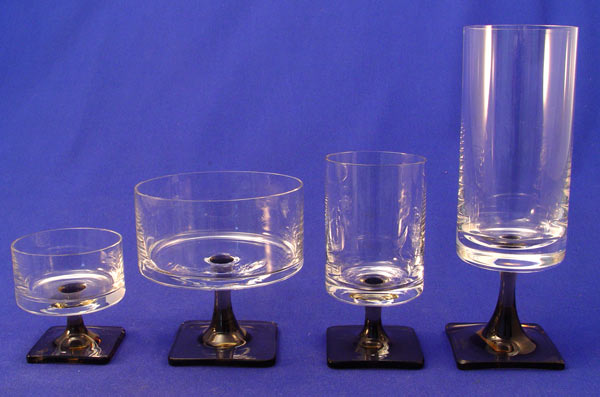 ROSENTHAL MODERNE CRYSTAL IN THE LINEAR PATTERN: Square smoke base. 49 pieces to include 10 goblets (6 1/2''), 3 goblets (7''), 12 sherberts, 12 red wine (4 1/4''), and 12 liqueur cocktails, (2 1/2''). Pattern discontinued in 1982. Compliments the china at the previous lot 1148.