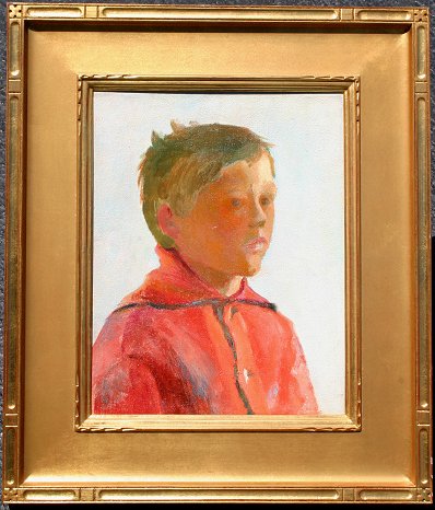 AMERICAN SCHOOL IMPRESSIONIST PORTRAIT PAINTING, O/B, 14'' x 11'': Boy in Red, carved gilt frame, 21'' x 18''.