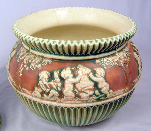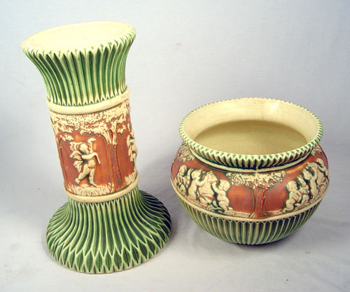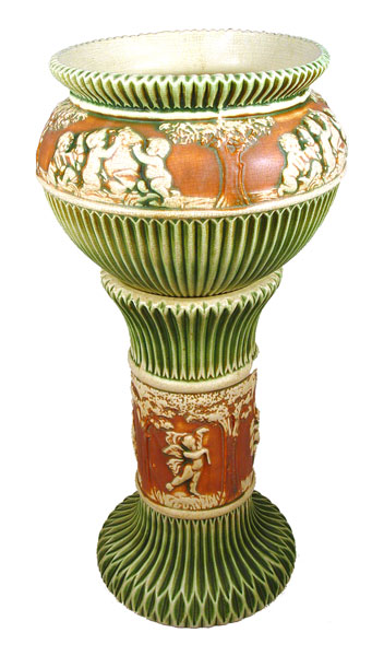 ROSEVILLE POTTERY DONATELLO JARDINIERE and PEDESTAL: 11'' dia. jardiniere, the pedestal is 18 1/2''. Total 29'' tall. Free of cracks and repairs, heavy crazing and flea bites to jardiniere rim.
