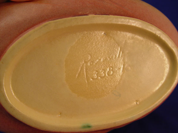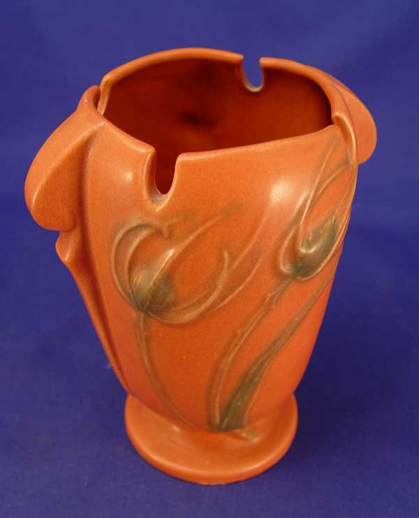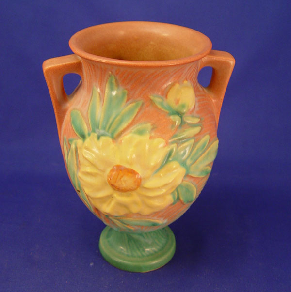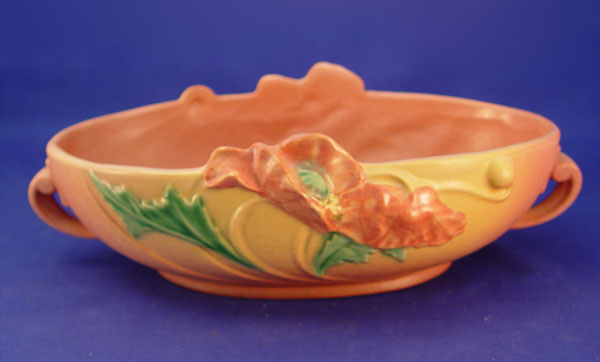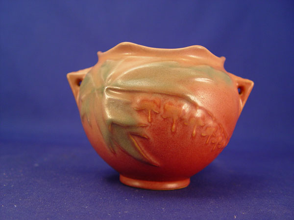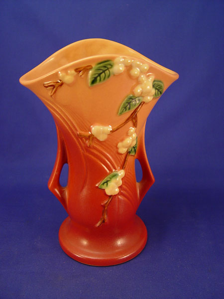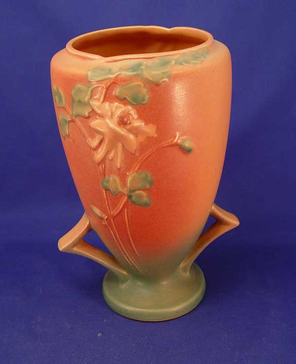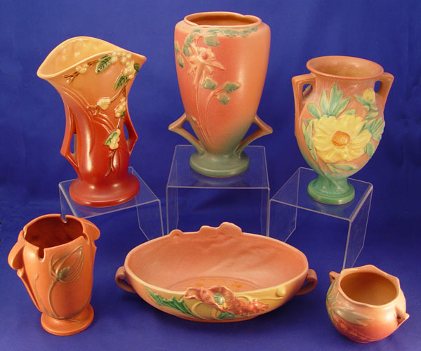 6 PIECE COLLECTION PINK ROSEVILLE POTTERY: All pink in color. 1) Snowberry vase, 9'' 2) Teasel vase, 882-6'' 3) Poppy vase, 338-10'' 4) Columbine vase 21-9'' 5) Peony console 8 1/2'' 6) Bleeding Heart 651-3''.