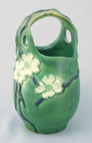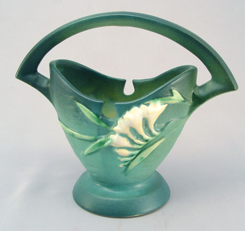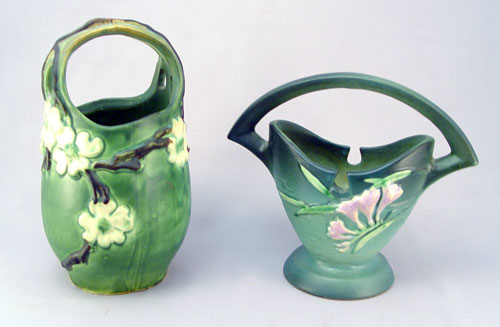 2 ROSEVILLE POTTERY BASKETS: Both green in color. Dogwood is 9''h., the Fressia is shape 390-7''.