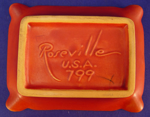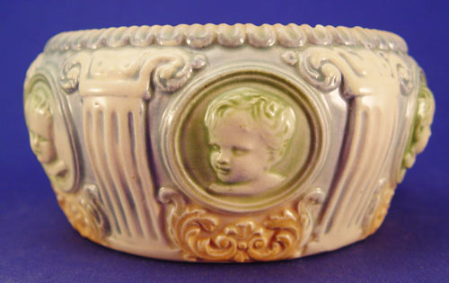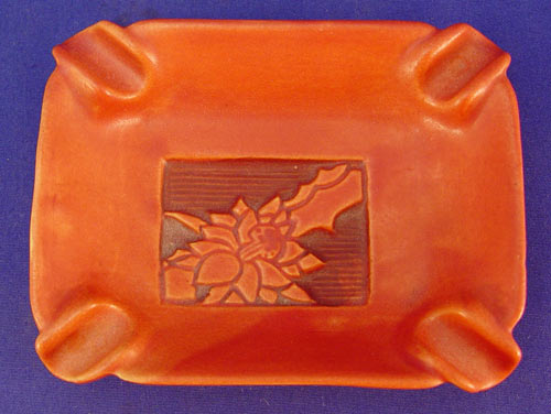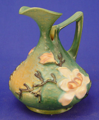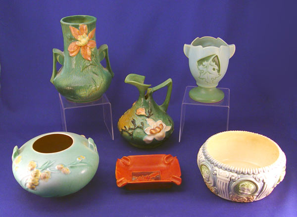 5 PIECE LOT ROSEVILLE POTTERY: 1) Magnolia Ewer, 6''. 2) Clematis Vase, 7''. 3) Ixia vase, 326-4'' 4) Panel Ashtray, shape 799, 5'' x 3 7/8''. 5) Silhouette Vase, 779-5''. Also in this lot is an unidentified cherub relief planter, 3 1/2'' h.