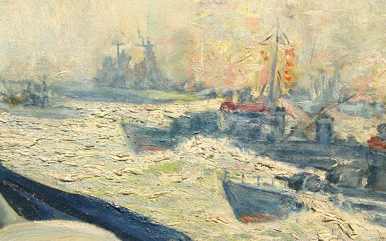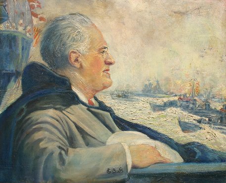 ILLUSTRATOR PAINTING F.D. ROOSEVELT VIEWING BATTLE AT SEA: O/C/B, 23 1/2'' x 29'', framed with wear, 26'' x 32'', unsigned, heavy impasto. Sporadic older inpaint restoration visible by black light, several flecks.