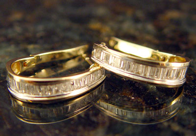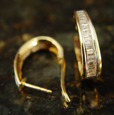 14K GOLD AND DIAMOND EARRINGS: 14K yellow gold hoop earrings with 37 baguette cut diamonds, approx. .75 Ct. Rated SI1-SI2 in clarity and H in color. The diamonds are channel set. Post and lever back closures. Weight: 5.9 grams.