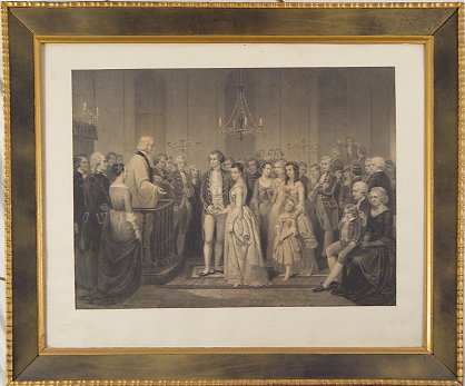 ''LIFE GEORGE WASHINGTON, THE CITIZEN'': Lithograph by Regnier, 21 1/2'' x 28'' with margins, gilded frame with wear, 27 12'' x 32 1/2''. Browning visible from front, water staining visible verso, sold as is.