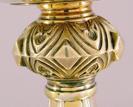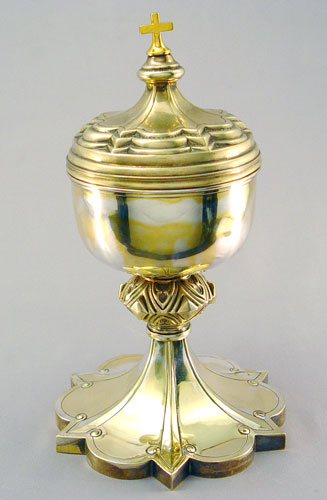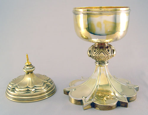 STERLING COMMUNION CHALICE: Vermeil sterling marked with unknown shield makers mark. Only cup appears to be sterling. Center and base are some other kind of metal with vermeil appearance. Lid has cross finial, also unknown metal. Please note loss of vermeil. Measures 10 1/4'' high to top of cross x 6 1/4'' base diameter.