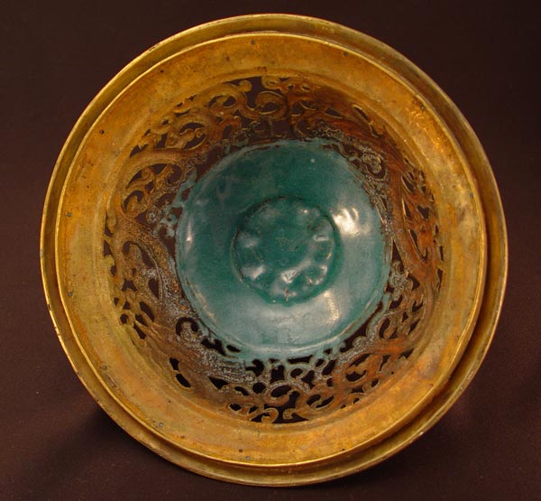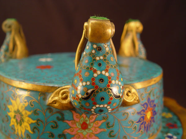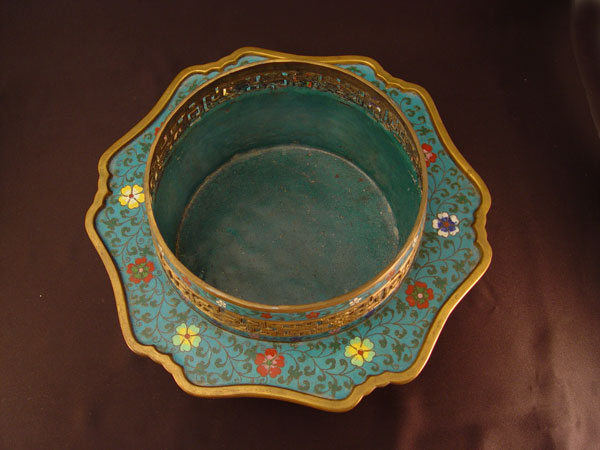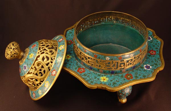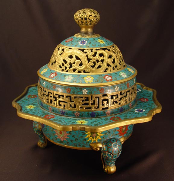 LARGE CHINESE CLOISONNE CENSOR: Figural water buffalo legs, reticulated top. 13'' h, 13'' dia. Earlier 20th C. Actual age unknown.