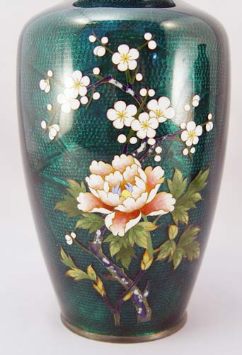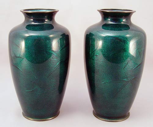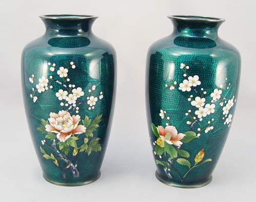 PAIR OF JAPANESE SATO CLOISONNE VASES: Green ginbari with floral decor. Underside marked ''Sato Cloisonne Silver''. 7 1/4''h.