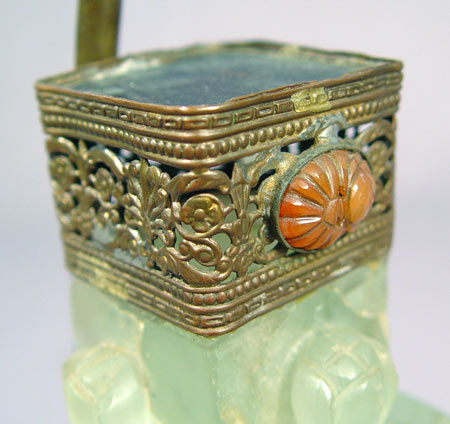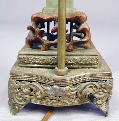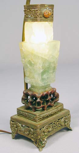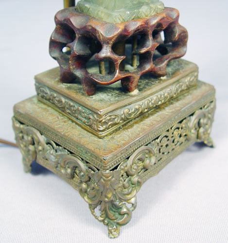 CARVED JADE LAMPS: Carved green stone, jade or quartz, set with a carved cabochon. The lamps are 24''h, the stone itself is 4 1/2''. Single socket.