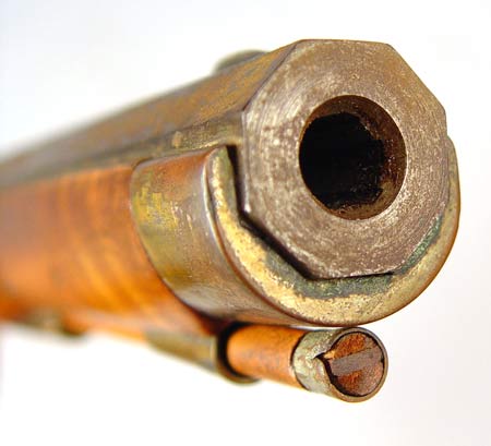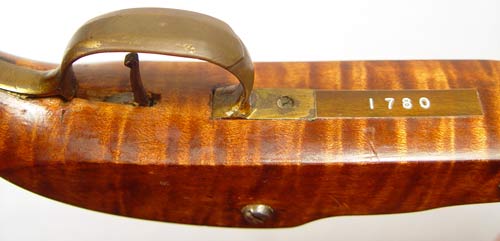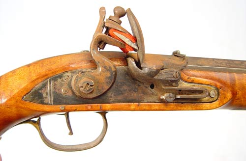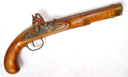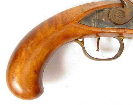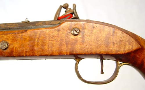 REPLICA TIGER MAPLE FLINTLOCK PISTOL: Unmarked flintlock replica with tiger maple wood. Barrel length 9 3/4'', overall 15 3/4''. Please note minor surface pitting to metal.