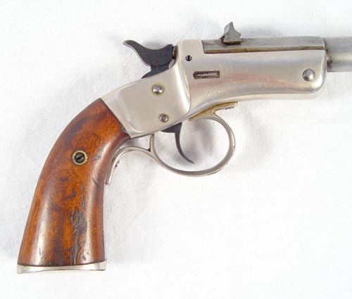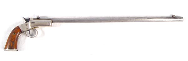 J. STEVENS ARMS ANTIQUE NEW MODEL POCKET RIFLE #40: Antique pistol with 17 7/8'' part octagon, part round approx. 22 cal. barrel marked J. Stevens A & T Co. Chicopee Falls Mass U.S.A.. Wood grips, nickel frame. Break front action nice and tight.