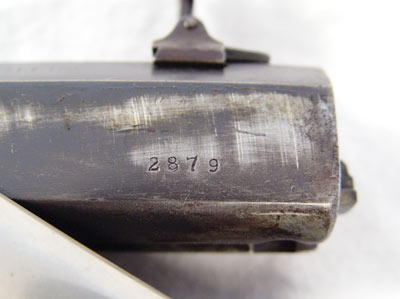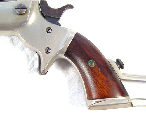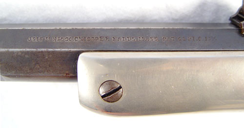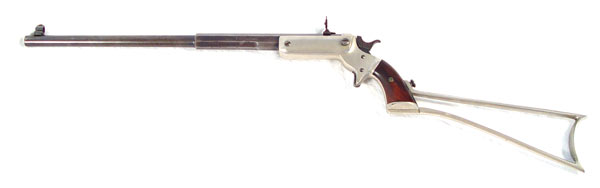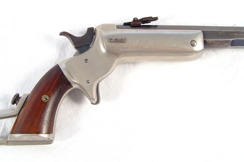 J. STEVENS & CO. ARMS ANTIQUE PET POCKET RIFLE #34: Antique target pistol with 18'' part octagon, part round approx 22 cal. barrel marked J. Stevens & Co. Chicopee Falls Mass Pat. Sept. 6. 1864. Heavy 1 1/4'' frame. Walnut grips and detachable metal shoulder stock. Break front action nice and tight. All original.