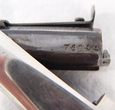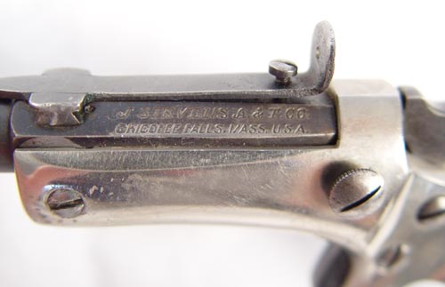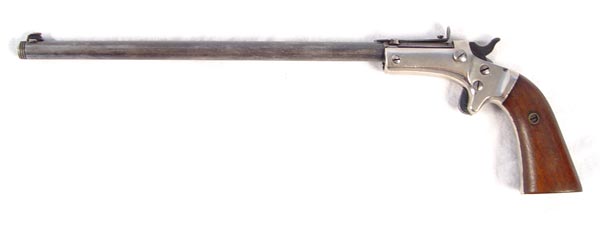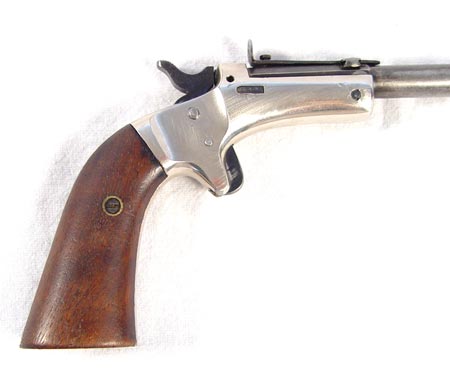 J. STEVENS ARMS ANTIQUE RELIABLE # 42 POCKET RIFLE: Antique pistol with 10'' part octagon, part round approx 22 caliber barrel marked J. Stevens A & T Co. Chicopee Falls USA. Nickel frame with wood grips. Please note modification to end of barrel. Some rubbing to break front action.