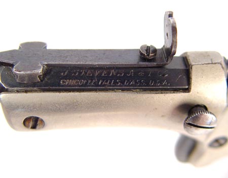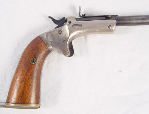 J. STEVENS ARMS ANTIQUE OLD MODEL POCKET RIFLE: Antique pistol with 10'' part octagon, part round approx. 22 cal. barrel marked J. Stevens A & T Co. Chicopee Falls Mass USA. Wood grips with removable metal shoulder stock. Nickel frame with some nickel loss. Break front action nice and tight.