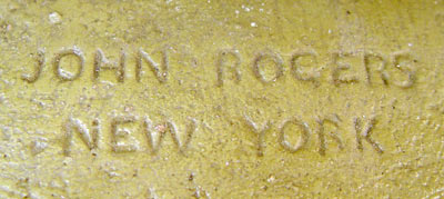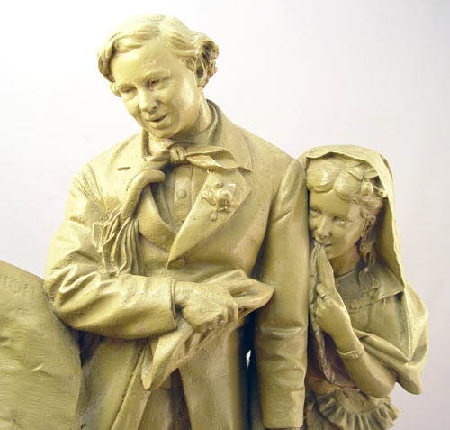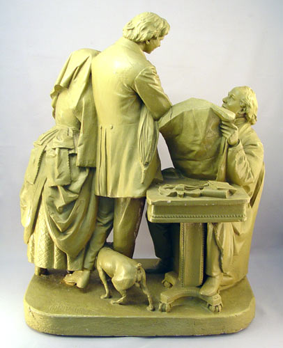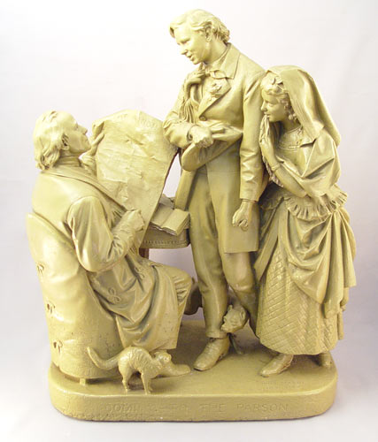 JOHN ROGERS GROUP STATUE: ''Coming to the Parson''. Plaster statuary. Touched up paint, missing dog tail. Measures 21 1/2'' high x 16 1/2'' wide x 10'' deep.