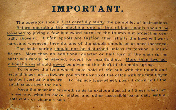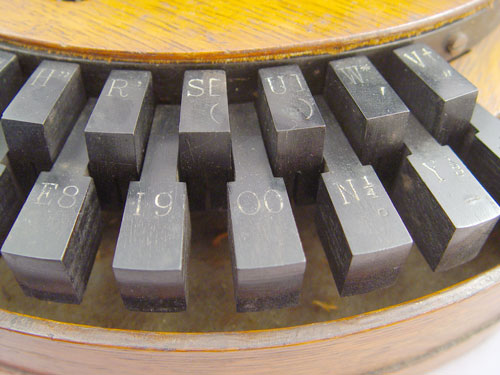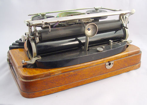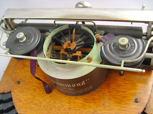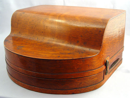 1884 HAMMOND TYPE I TYPEWRITER WITH OAK CASE: Late 19th century marked ''Hammond'' on split type shuttle. Semi-circular Keys engage shuttle when pressed, shuttle rotates left to right correctly, unsure of complete working condition. Cased in wood case with wood cover, with paper tag instructions on inside cover. Right ribbon spool is missing half of top piece. Serial number 15103. Measures 6 7/8'' high x 14'' wide x 12'' deep. Sold with ''The Wonderful Writing Machine'' book by Bliven.