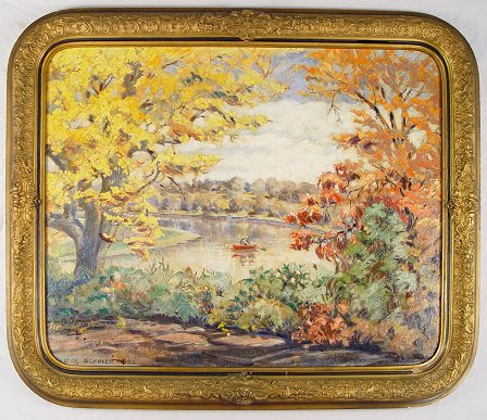 SCHOLER SR, Walter, (American, 1890-1972): ''Black Rock on the Wabash'', Oil/Canvas Board, 22'' x 28'', signed and dated 1952, period frame gilded gesso molding with over-paint and wear, 27'' x 33''. Indiana architect and artist.