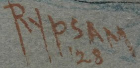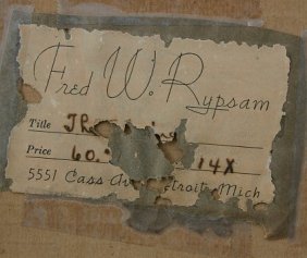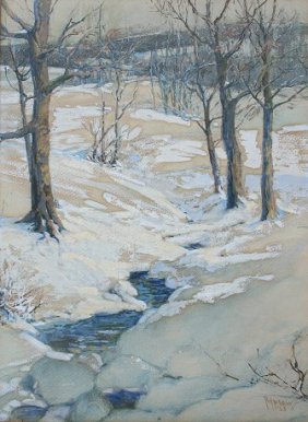 RYPSAM, Fred W., (American, 1880-1969): Winter stream, W/C and Gouache, sight size 19'' x 14'', signed lower right and dated 1928, original Rypsam label affixed verso with partially obliterated title. Condition - Laid with some lifting of paper, overall browning.