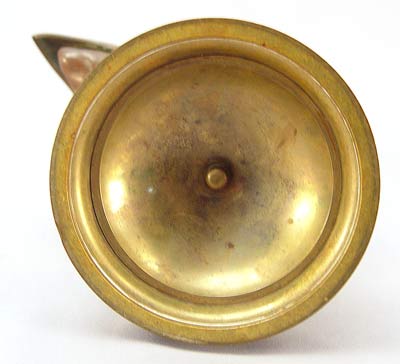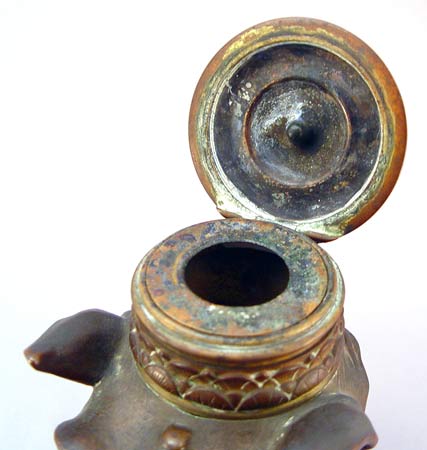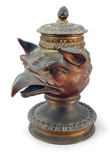 BRONZE EAGLE HEAD FIGURAL INK STAND: Finely detailed with hinged top. Good patina with faint remains of a gilt finish. There is a bend to the finial. 6 3/4''h. 3 7/8'' dia. at the base.