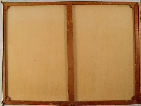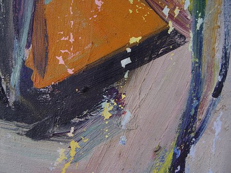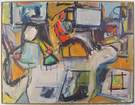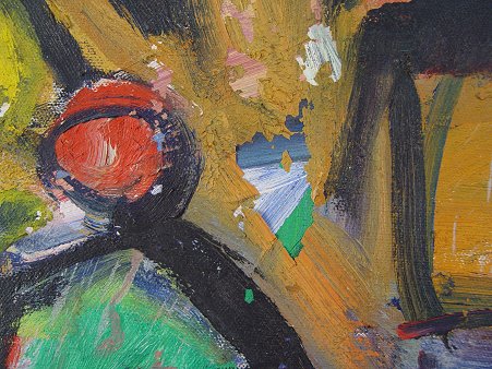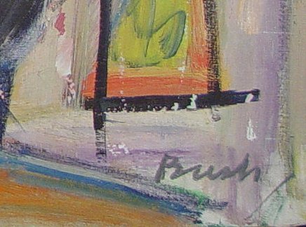 ABSTRACT OIL/C SIGNED BUSH: Very good quality, 30'' x 40'', thin edge frame. Numerous abrasions, several punctures and paint fleck.