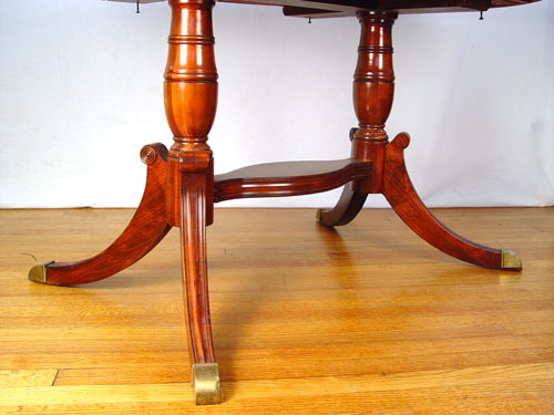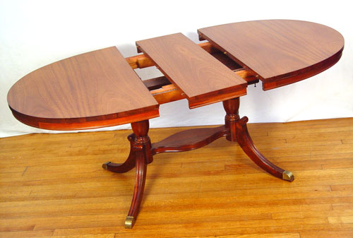 MAHOGANY OVAL DINING TABLE: Jefferson Woodworking Co. double pedestal supported by stretchers. Measures 29 1/4'' high x 66'' x 38'' with 17'' leaf intact.