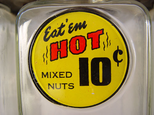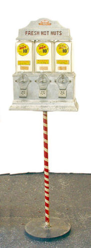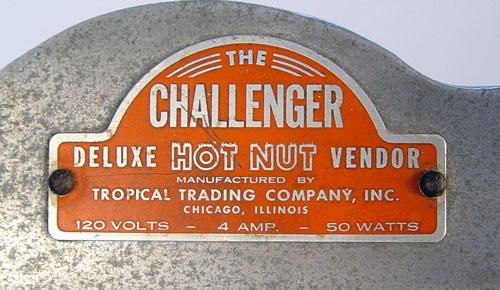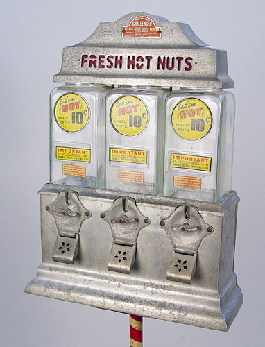 THE CHALLENGER DELUXE HOT NUT VENDOR: Triple glass canisters dispense hot peanuts. Manufactured by Tropical Trading Co. Aluminum case, glass canisters. Working order unknown, no key. 55''h. x 16'' x 6''.