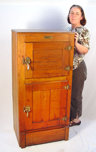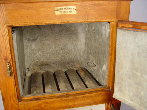 WHITE MOUNTAIN OAK ICE BOX: 2 door ice box with tin lined upper section, porcelain lined lower section. White Mountain label. 52''h. x 18'' x 25''.