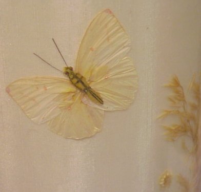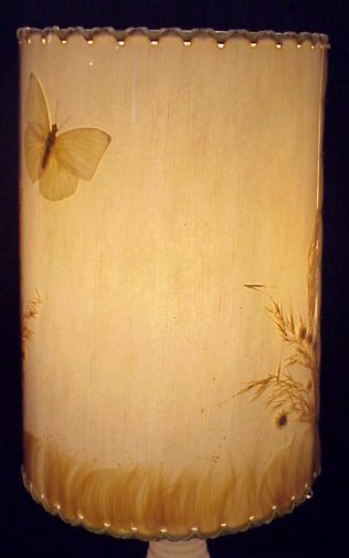 VAN BRIGGLE POTTERY LAMP WITH ORIGINAL BUTTERFLY SHADE: White matt pottery incised Van Briggle mark and H in a circle. 18 1/2''h. overall.