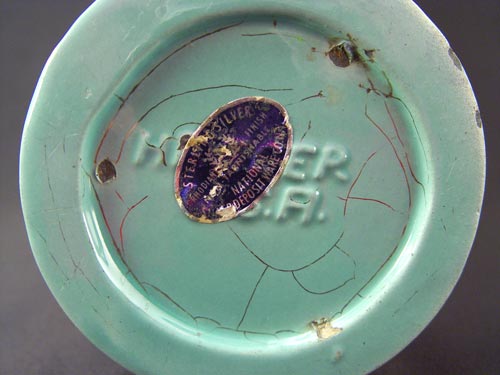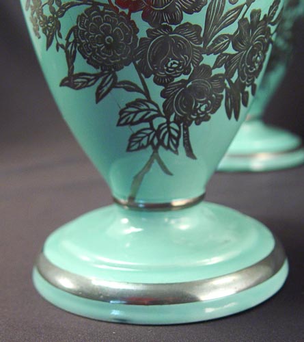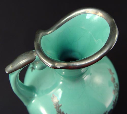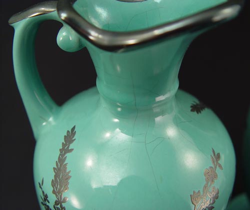 PAIR HAEGER POTTERY SILVER OVERLAY EWER VASES: Silver overlay Haeger Pottery. 9'' high. Paper label and raised mark.