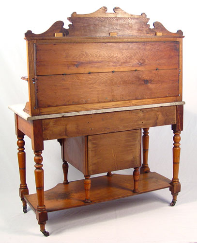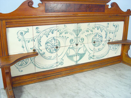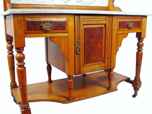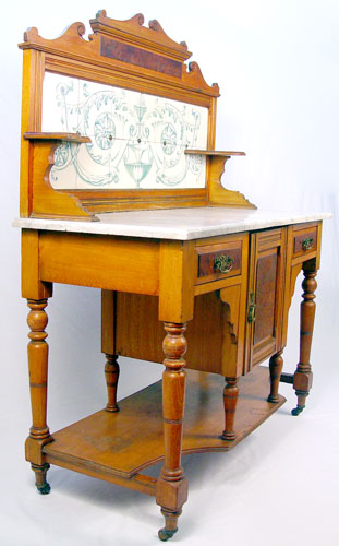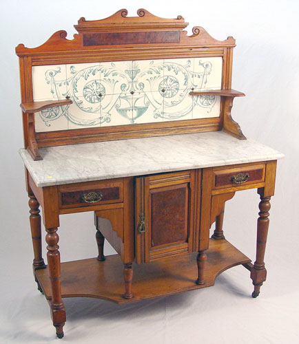 TILE BACK MARBLE TOP WASHSTAND: White beveled marble over 2 burled panel drawers and cabinet door. 12 tiles create ornate fountain and acanthus leaf scroll design. Measures 52 1/2'' high x 42'' wide x 19'' deep.
