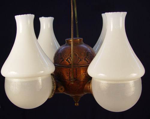 EMBOSSED COPPER ANGLE LAMP: Converted to electricity. 4 light hanging Angle light. Thumb wheels labeled ''Angle Mfg. Co.''. Approx 20'' span. hangs 17''.